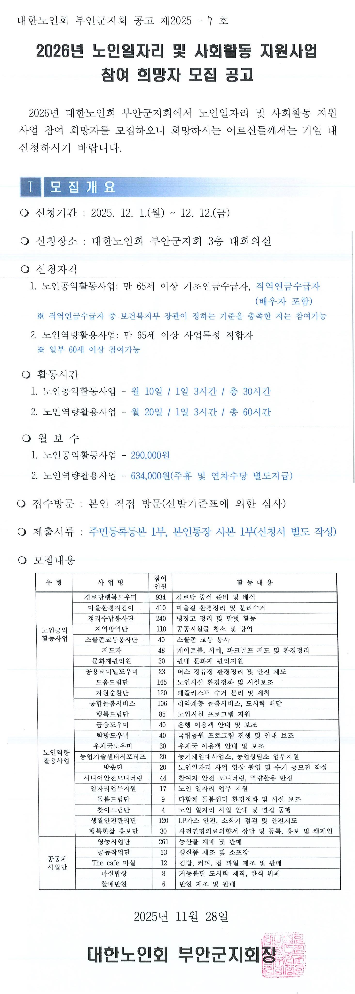 2026년 노인일자리 및 사회활동 지원사업 참여 희망자 모집 공고 |
