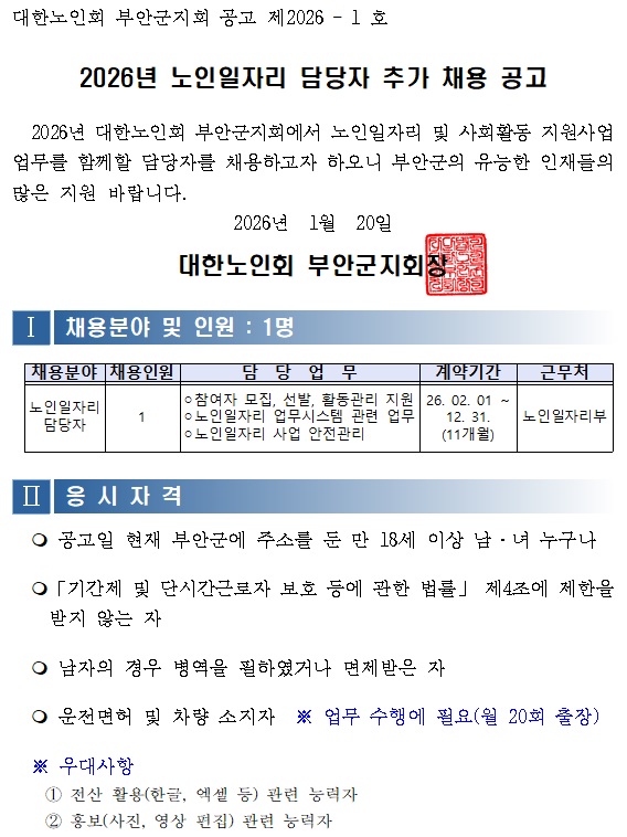 2026년 노인일자리 담당자 추가 채용 공고 |