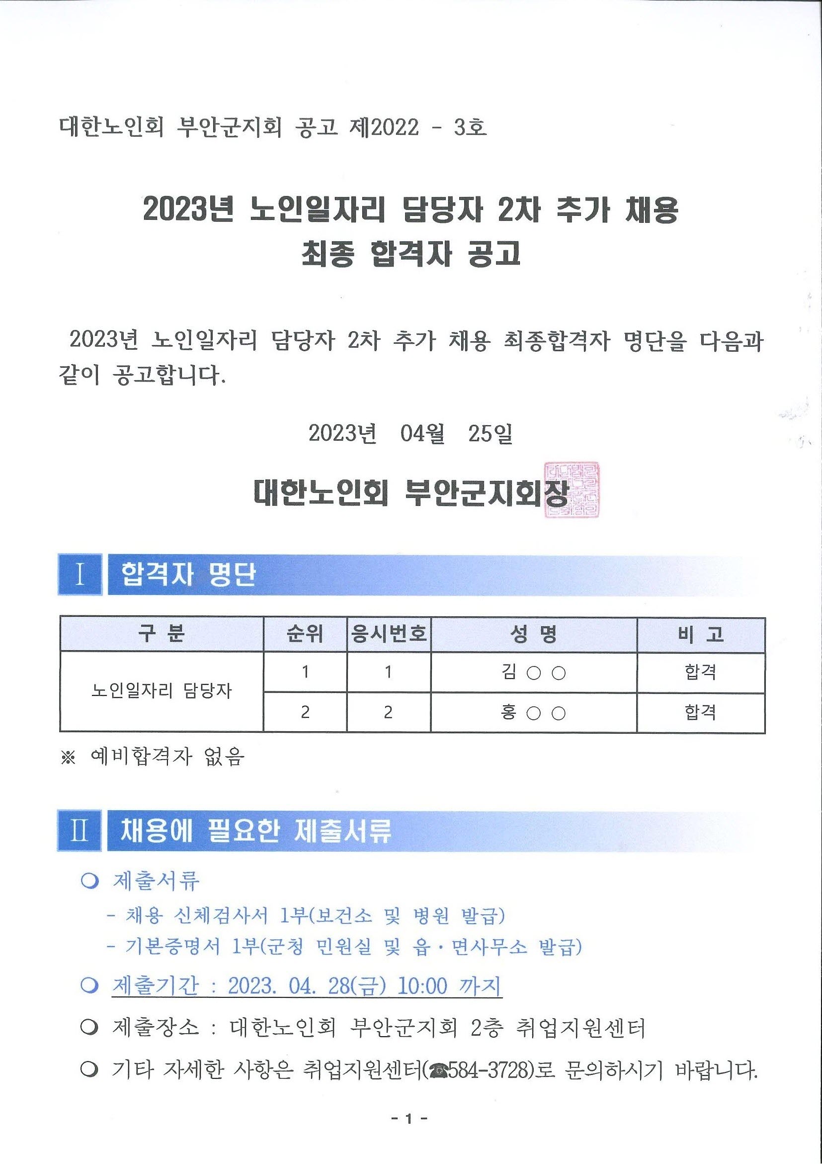 2023년 노인일자리 담당자 2차 추가 채용 최종 합격자 공고 |