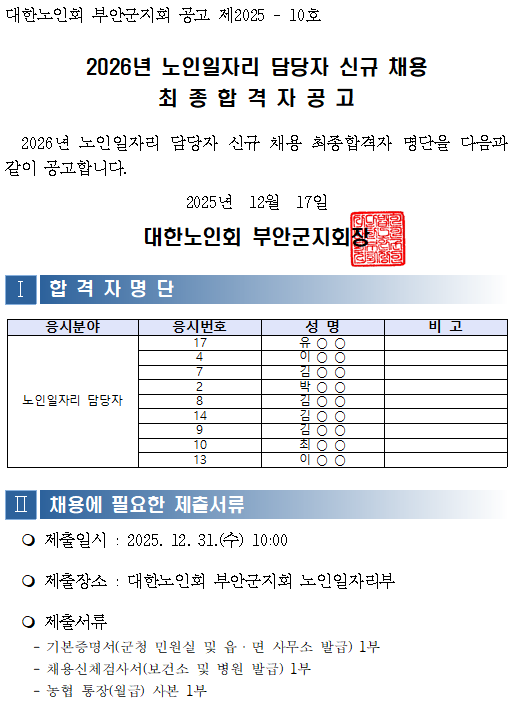 2026년 노인일자리 담당자 최종합격자 공고 |