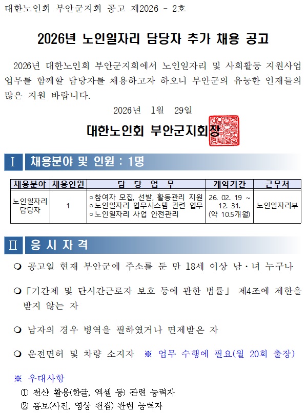 2026년 노인 일자리 담당자 추가 채용 재공고 |