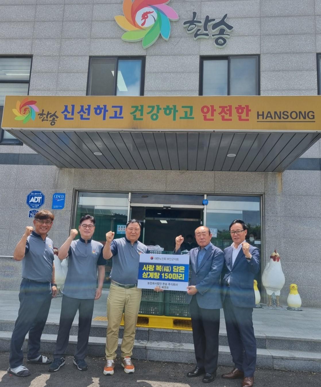 대한노인회 부안군지회(지회장 김성태)는 초복을 앞두고 지난 7월 15일 농업회사법인 한송 주식회사(대표 배영화)로부터 삼계닭 150마리를 전달받았다.